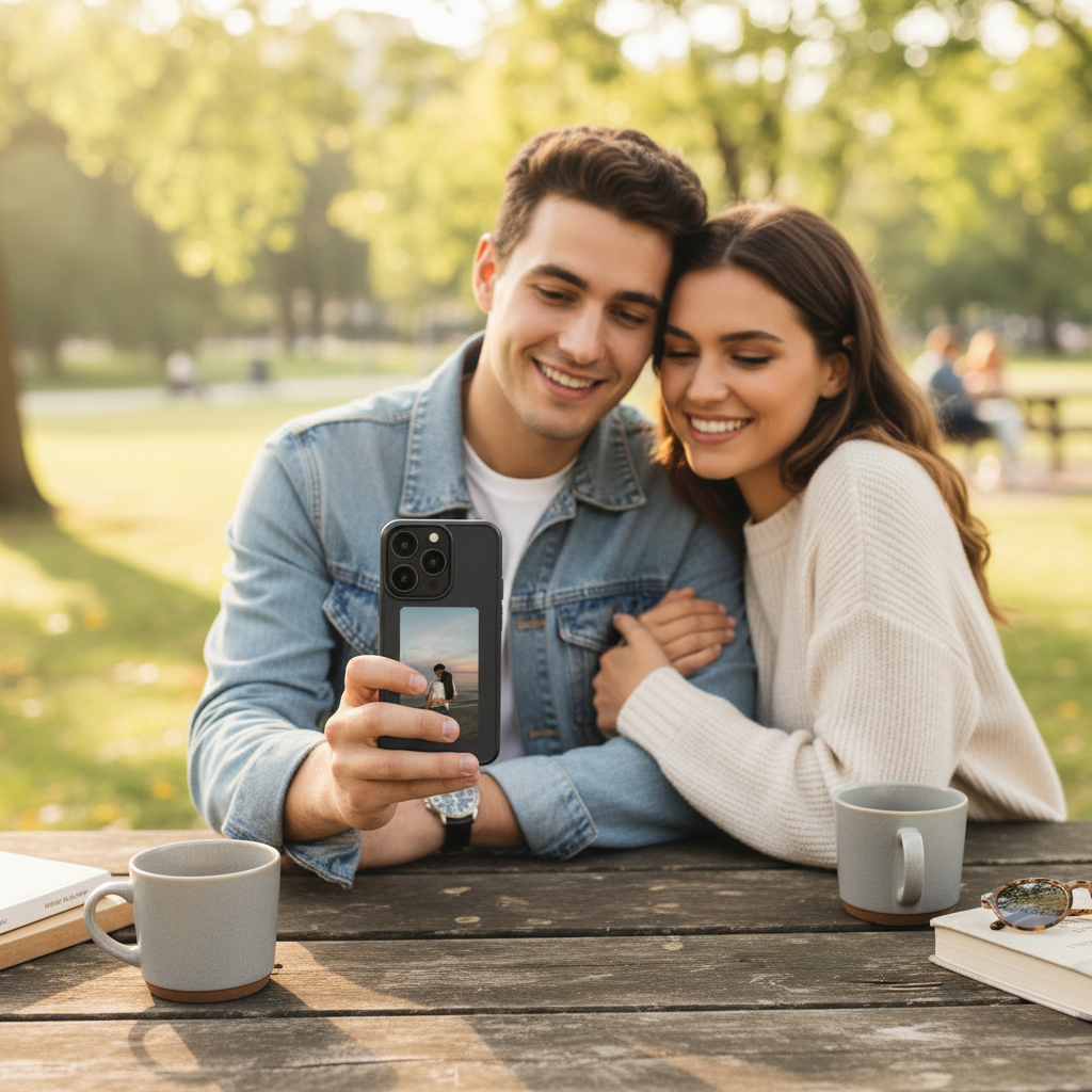 The only case that evolves with you. Upload cherished photos and switch designs instantly. E-Ink display stays vibrant without charging.